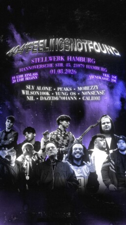 404*FeelingsNotFound steht für eine neue, unabhängige Generation von Artists, die ihre Geschichten ungefiltert erzählen und ihre Fanbases direkt aus der digitalen Kultur heraus formen. Das Konzert verspricht eine emotionale und klanglich vielseitige Reise durch die Gedankenwelt einer neuen Hip-Hop-Generation.